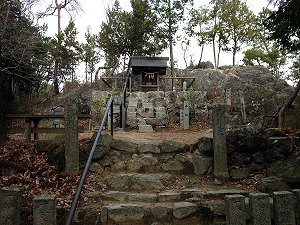 石上布都魂神社の社殿は大松山の中腹にありますが、そこからさらに奥へ登り山頂に行くと、本宮(奥の院)と磐座があります。もとはこの本宮に社殿があったのですが、明治末期に火災で焼失したため、現在の中腹の地に再建されました。